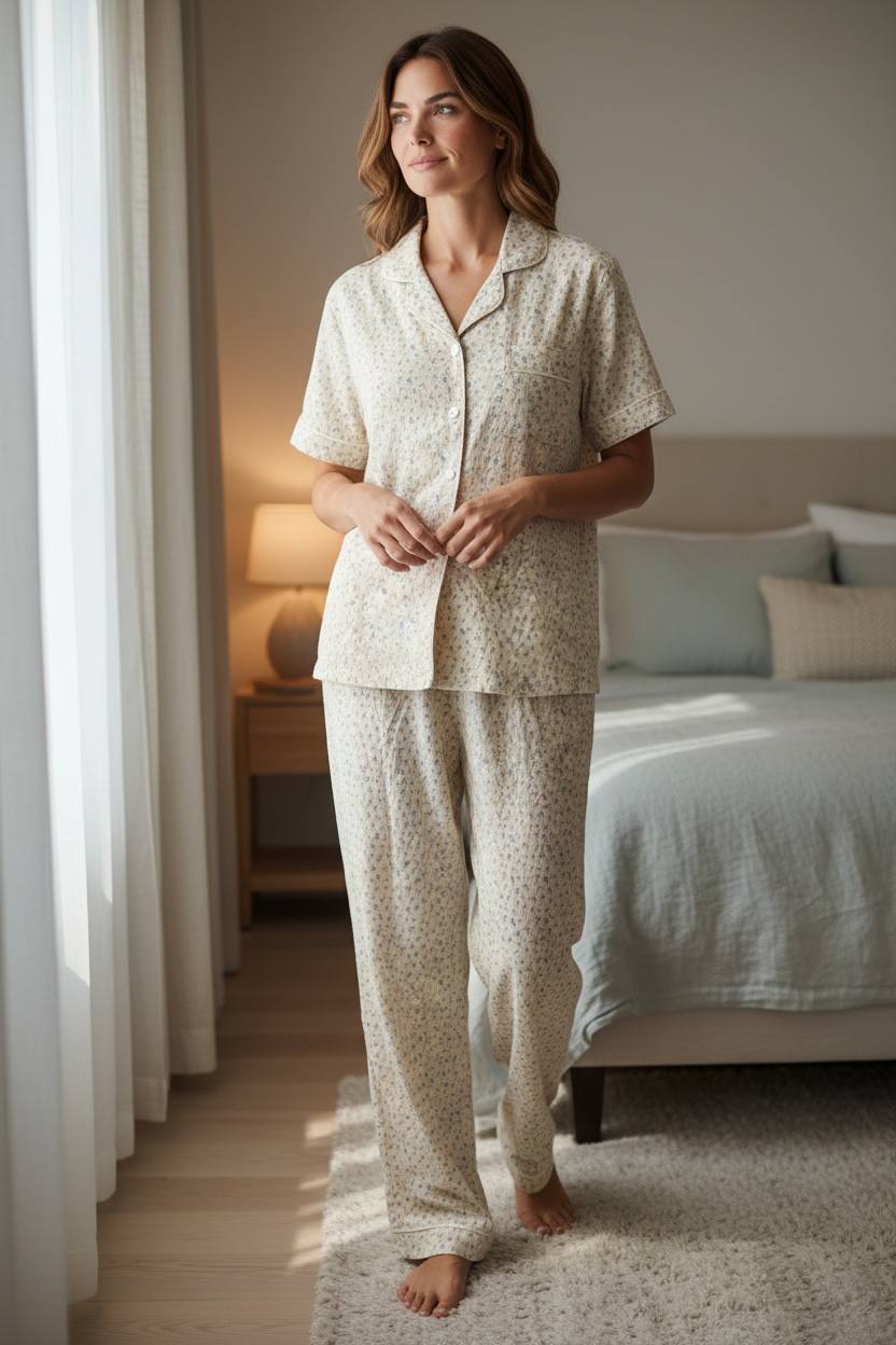 سواءً كنت تستمتع بصباح هادئ أو تسترخي بعد يوم طويل أو تسترخي في المنزل، فإن طقم البيجاما هذا يوفر لك التوازن المثالي بين الجمال والنعومة والعملية.