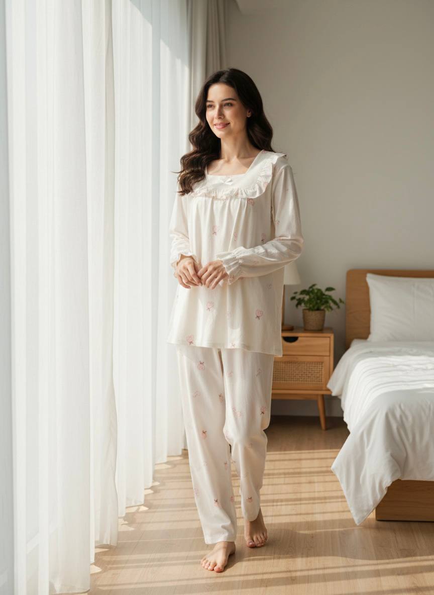 طقم بيجامة مصمم بشكل جميل مكون من قطعتين يتميز بقميص ناعم بأكمام طويلة وبنطال متناسق بطول كامل، مصنوع من قماش خفيف الوزن يسمح بالتهوية لتوفير الراحة والأناقة والاسترخاء طوال الموسم.