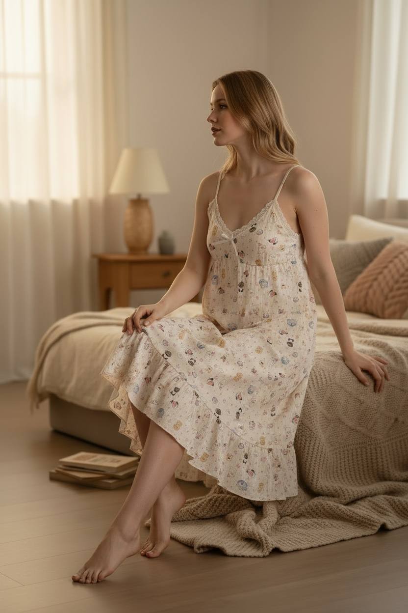 فستان النوم هذا مثالي لليالي الدافئة أو للاسترخاء في المنزل أو كهدية مدروسة، فهو يجمع بين النعومة والأناقة والعملية في قطعة واحدة لا تتأثر بمرور الزمن.