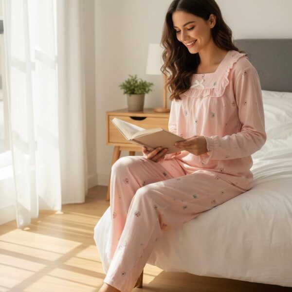 A soft, breathable two-piece pajama set designed for ultimate comfort and feminine elegance. Perfect for lounging, sleeping, and relaxing at home in all seasons.