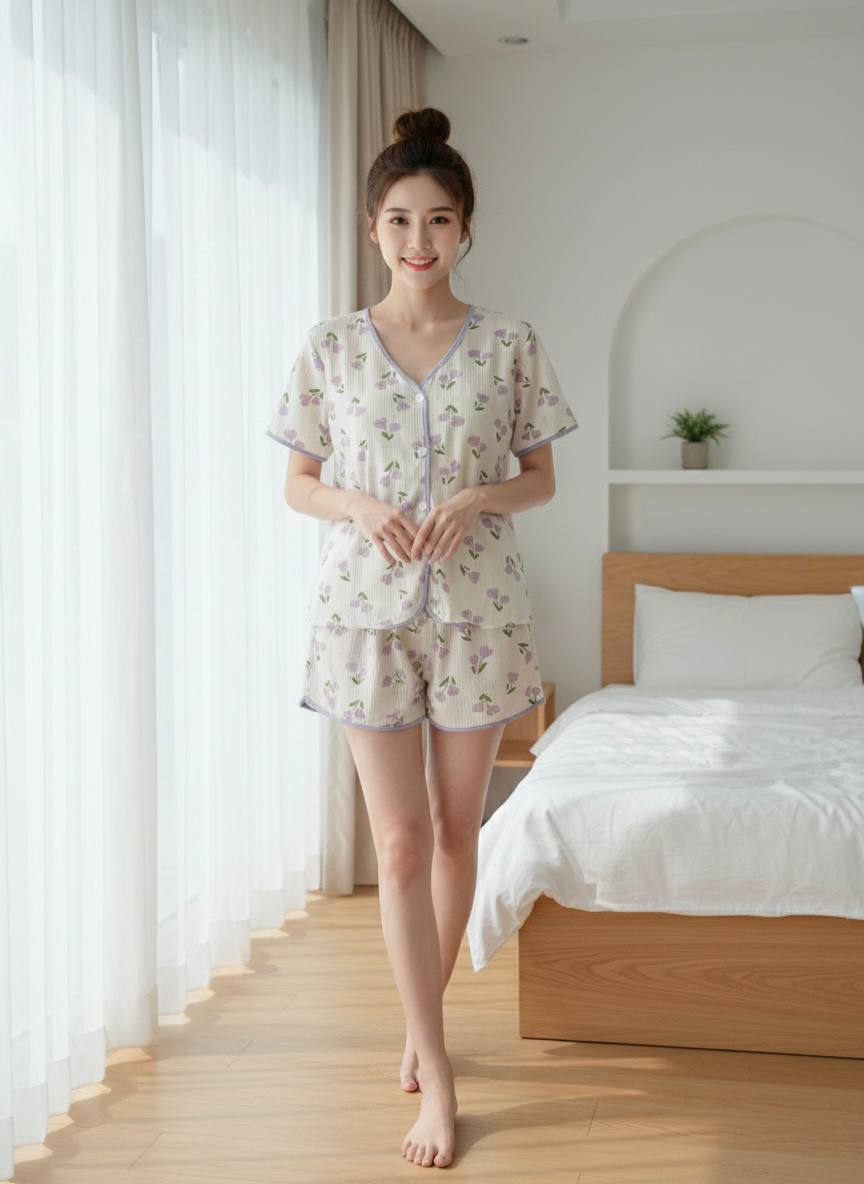 The lightweight and airy material feels gentle on the skin, making it ideal for warm climates and year-round indoor wear. The relaxed fit ensures freedom of movement, while the playful printed design adds a fresh, feminine touch. Whether you’re lounging at home, enjoying a morning coffee, or winding down for the night, this pajama set offers the perfect balance of comfort and elegance.