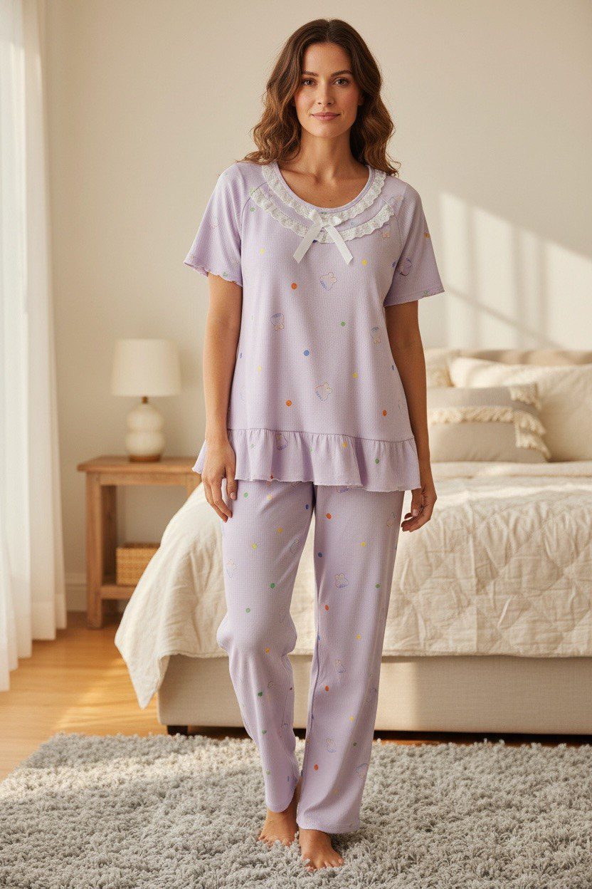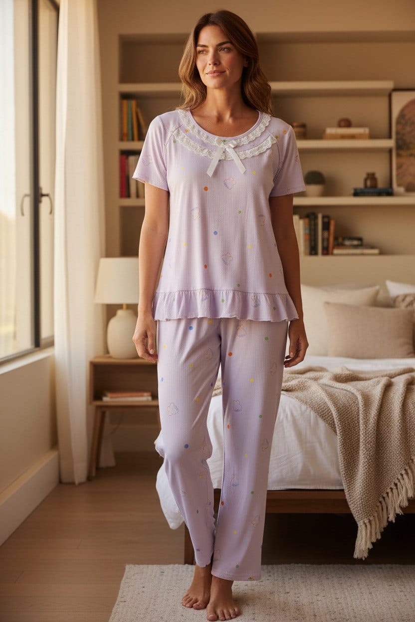 Made from a soft and breathable fabric, the pajama set offers a relaxed fit that feels gentle on the skin. The subtle dotted and cloud-inspired print combined with soft pastel tones creates a calm, feminine look perfect for sleeping, lounging, or enjoying quiet moments at home.