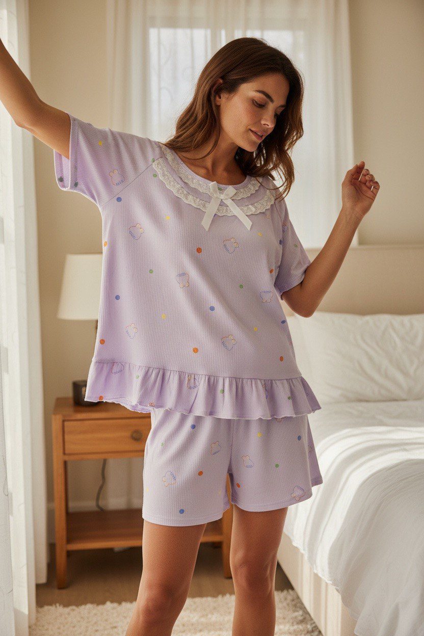 This complete set includes a short-sleeve top with a delicate lace neckline and bow detail, paired with matching long pants and shorts for flexible styling throughout the day and night.