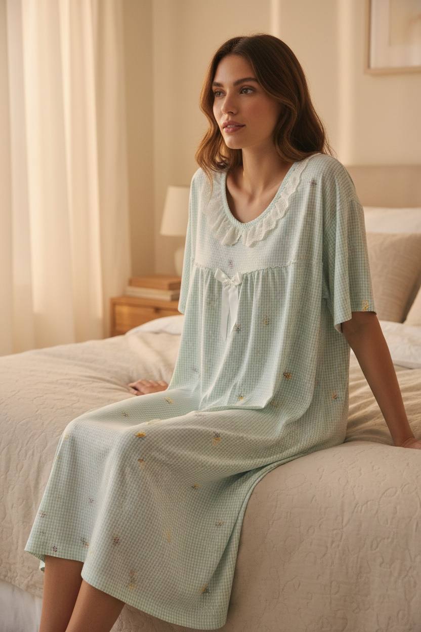 A soft and elegant one-piece nightdress designed for everyday comfort. Featuring a delicate lace-trim neckline, subtle floral print, and a relaxed midi-length fit—perfect for restful nights and cozy mornings.