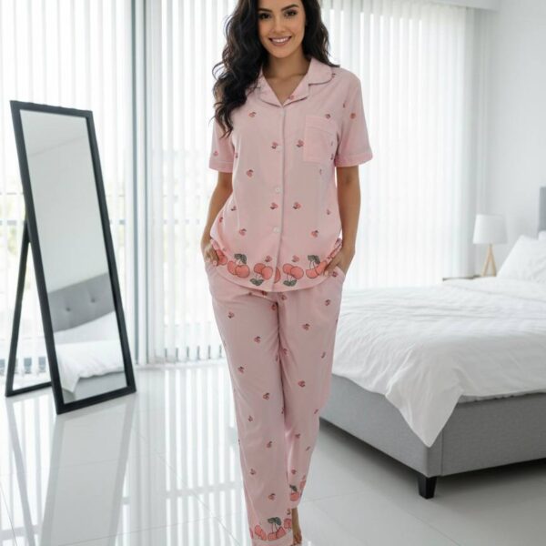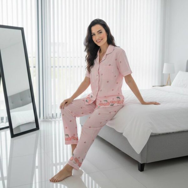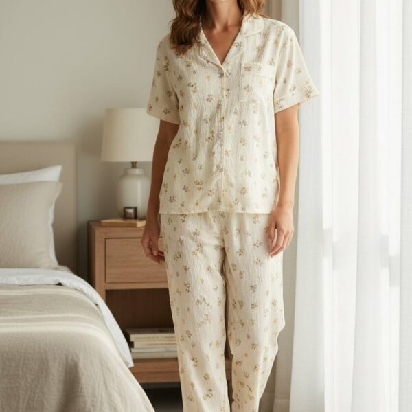 Soft, breathable women’s pajama set with a delicate floral print, featuring a short-sleeve button-up top and relaxed-fit pants. Perfect for cozy nights and stylish mornings at home.